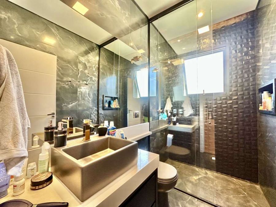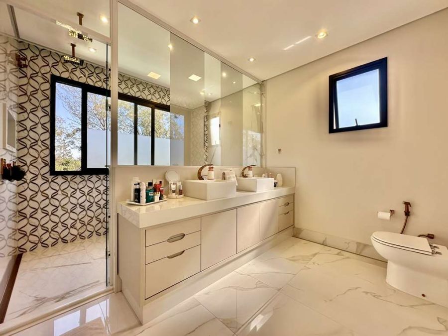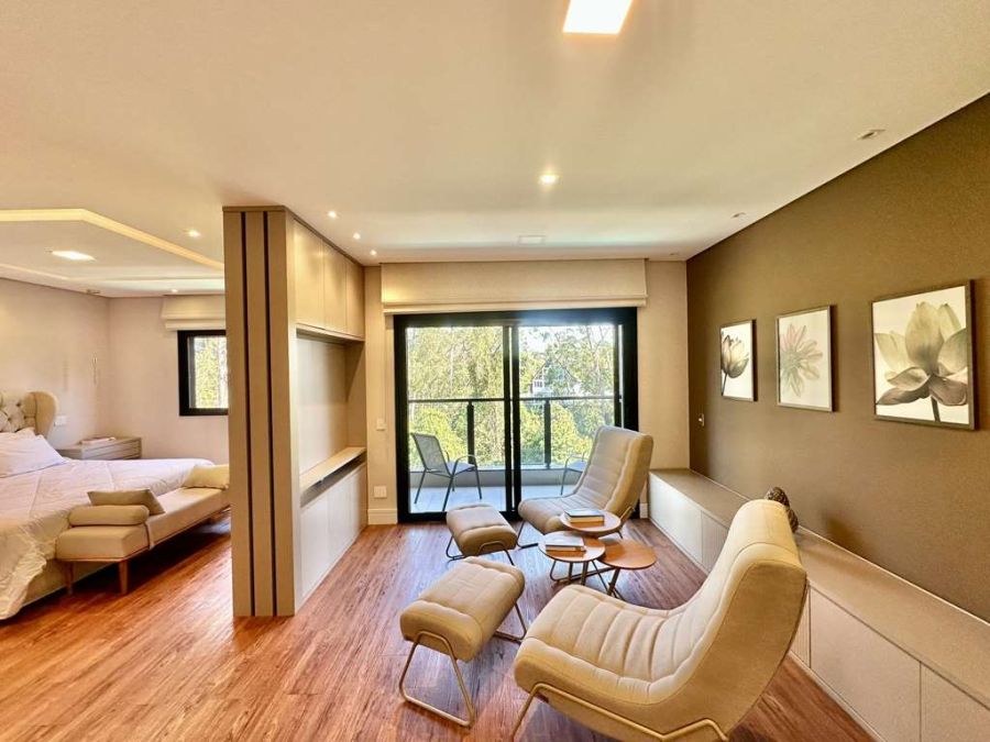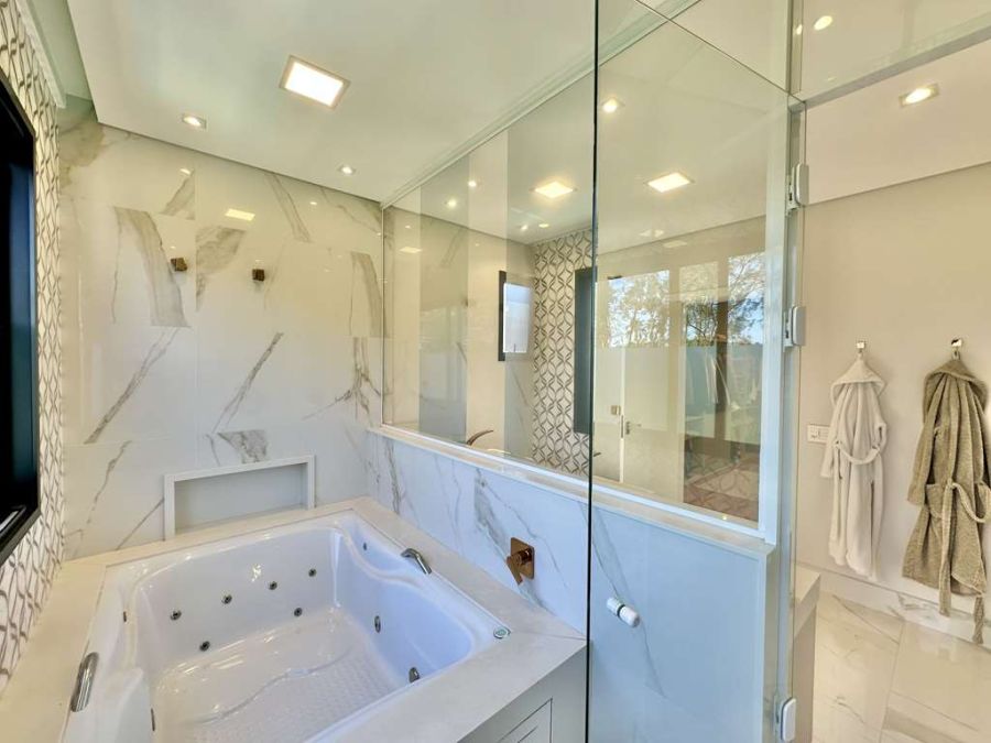 Suítes que são Santuários: As 3 suítes originais foram transformadas em 2 suítes planejadas amplíssimas, ambas com closets, varandas e vista para a natureza. Destaque para a suíte master super ampliada, um verdadeiro refúgio com saleta, closets Sr. e Sra. (com ilha, penteadeira e vitrines), e um banheiro master com 2 cubas, 2 duchas, hidro dupla com nicho e uma vista privativa para a natureza. Todos os banheiros possuem acabamentos de ponta, com tampos em quartzo, torneiras mono comando e box de vidro até o teto.