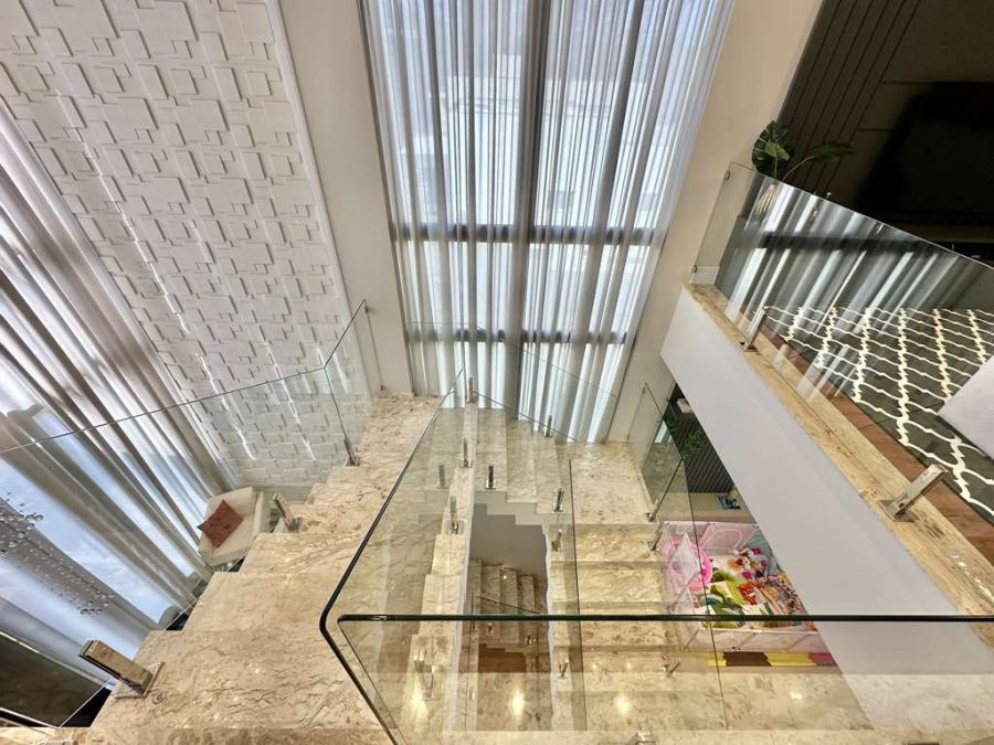 Ao adentrar pelo imponente hall social, através de uma porta pivotante espelhada com fechadura eletrônica, você será recebido por uma saleta e um surpreendente piso de vidro panorâmico sensorial que revela um charmoso jardim de inverno. Os ambientes são um convite à fluidez: