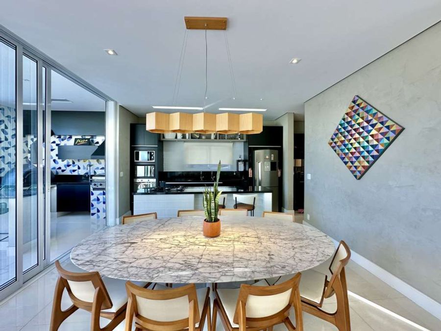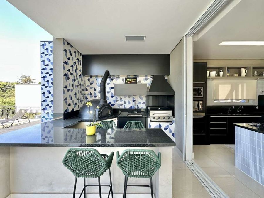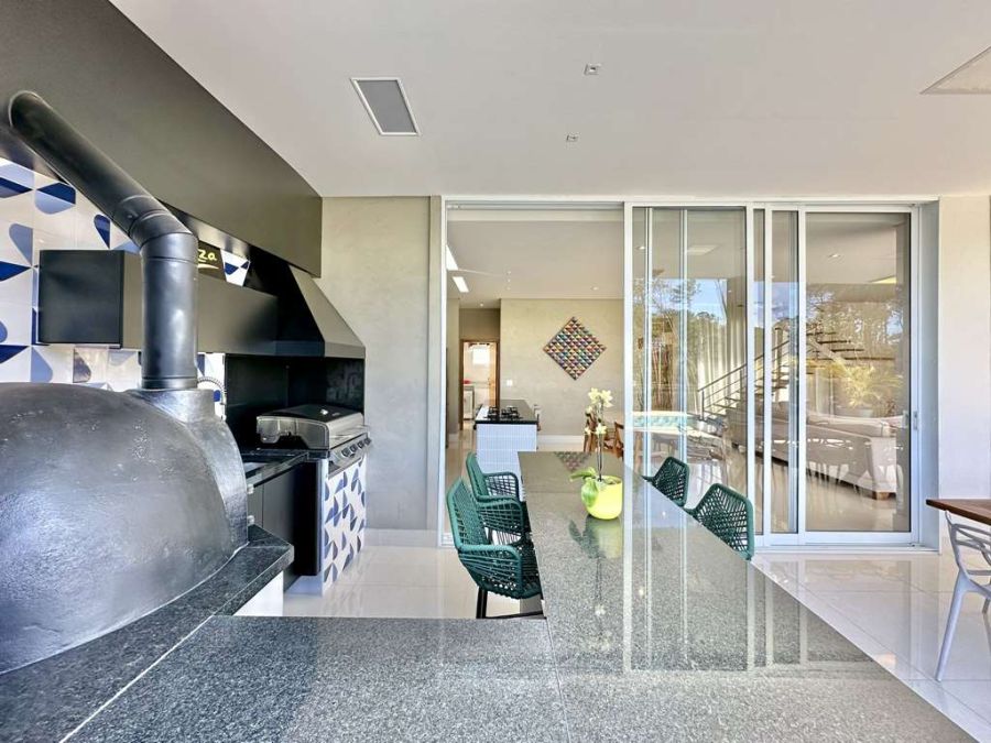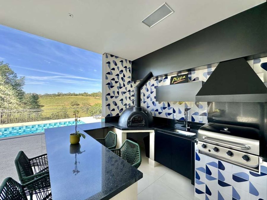 Varanda Gourmet dos Sonhos: Integrada à piscina, com total privacidade e vista, este espaço é perfeito para momentos de confraternização. Conta com forno de pizza, churrasqueira a gás Cher Broil, coifa, bancada, balcão em granito, cuba inox e gabinetes. Espaço para rede, estar e refeições com mesa para 8 lugares.