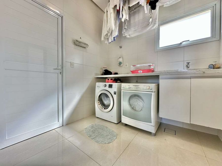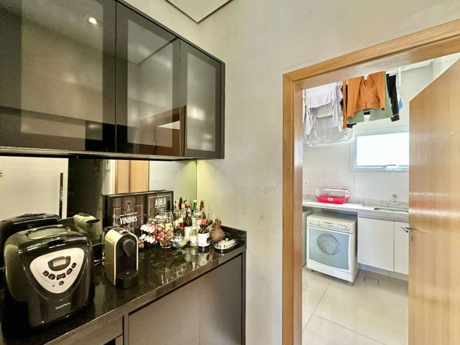 Área de Serviço: Lavanderia fechada integrada à cozinha, com tanque inox, tampo em mármore, gabinete, e um banheiro de serviço completo com chuveiro elétrico.