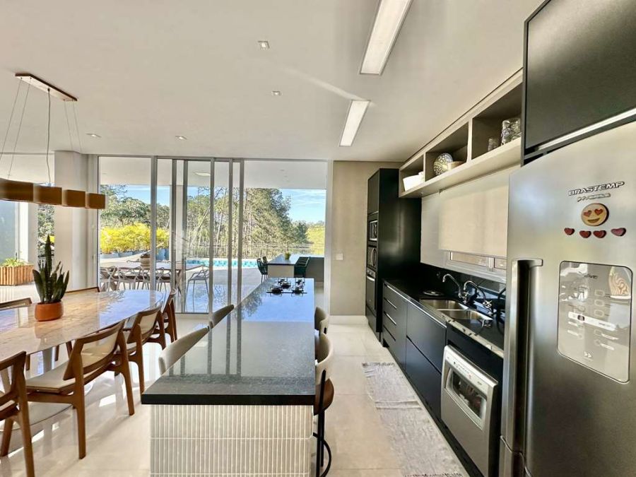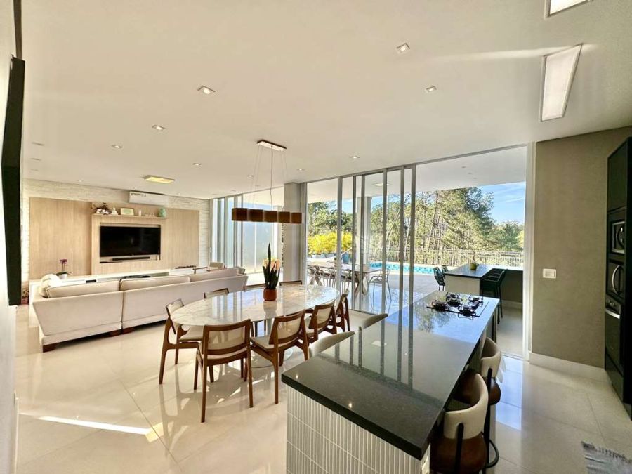 Living Integrado ao Lazer: O coração da casa é um espetacular living para 6 ambientes (estar, lareira a gás, TV, jantar, bar/café e cozinha), todos com ar-condicionado e uma parede em canjiquinha, que se integra perfeitamente à varanda gourmet.Espaço Bar e Café: Uma charmosa copinha planejada com frigobar, bancada e armários.