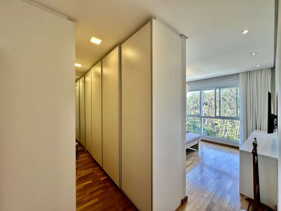 Suítes Aconchegantes: Três suítes totalmente planejadas, com painéis, criados-mudos e janelas panorâmicas envidraçadas com persianas elétricas. Destaque para a suíte master com um amplo closet Sr. e Sra., e uma das suítes com espaço para closet. Os banheiros são decorados com painéis, tampos white prime, espelhos, gabinetes, box de vidro e nichos, sendo a master com 2 cubas e 2 duchas.