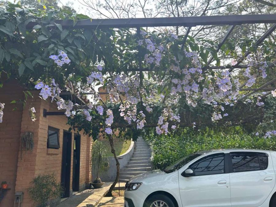 Garagem para até 5 carros sob pergolado florido.