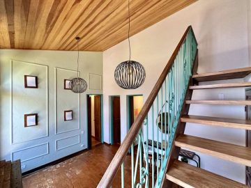 Escada de Madeira: Com guarda-corpo de ferro e corrimão de madeira, é uma obra de arte à parte.