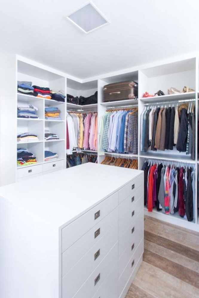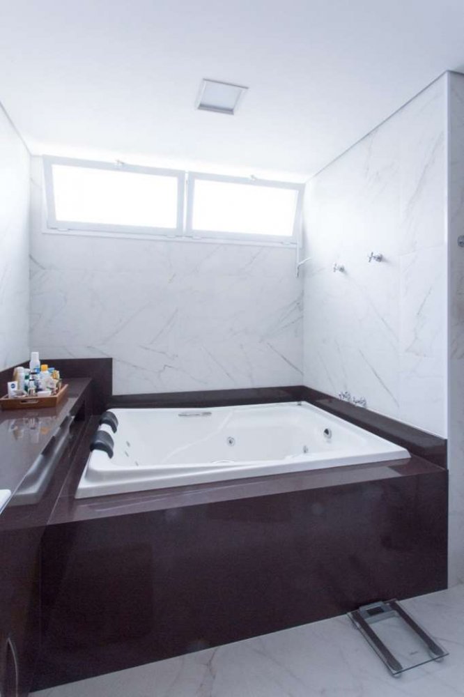Suíte master com cerca de 24 m2, com quarto de vestir de 16 m2 todo cercado com armários, gaveteiros e prateleiras planejados, e banheiro com ducha e jacuzzi dupla com hidromassagem e cromoterapia.