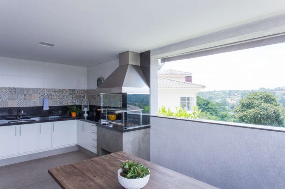 Espaço gourmet integrado a piscina e a cozinha, com enorme bancada toda em granito e pia, churrasqueira a carvão com rotação dos espetos elétrica.