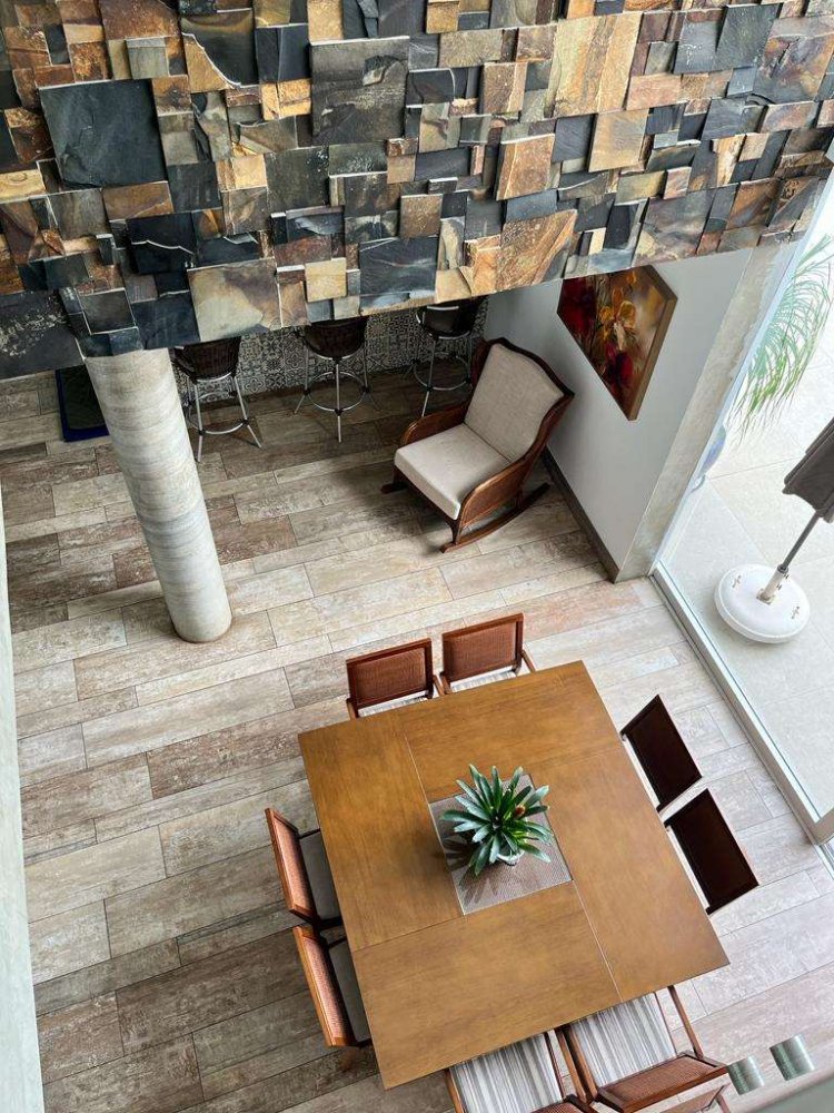 Salas de jantar e living facilmente integráveis a área da piscina através de portas de correr.