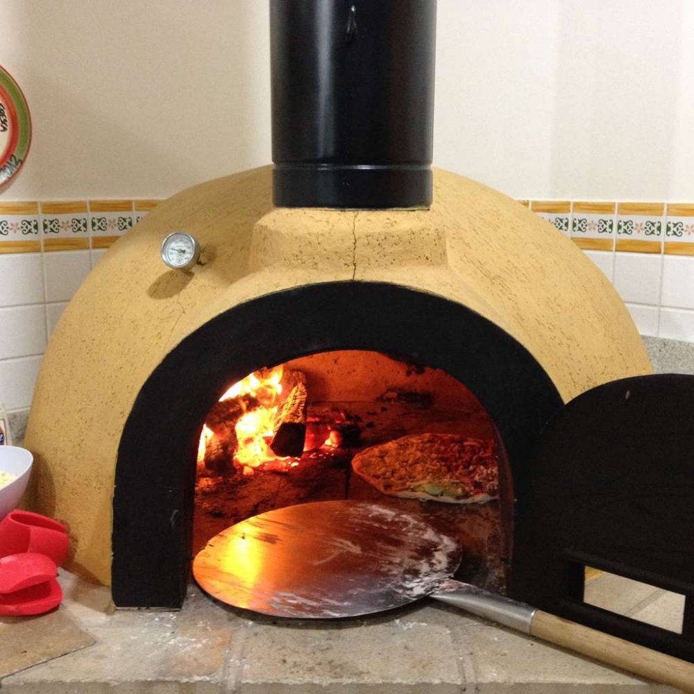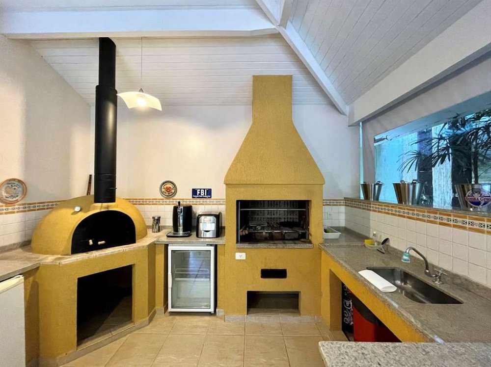 Varanda gourmet com pia, churrasqueira e forno de pizza.