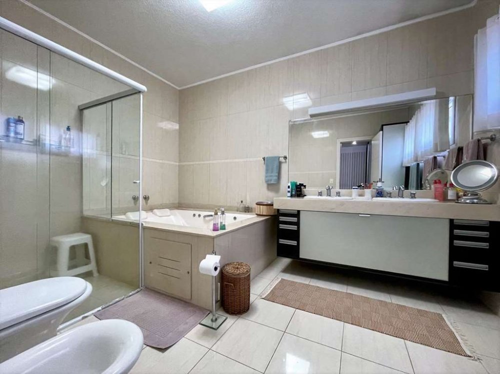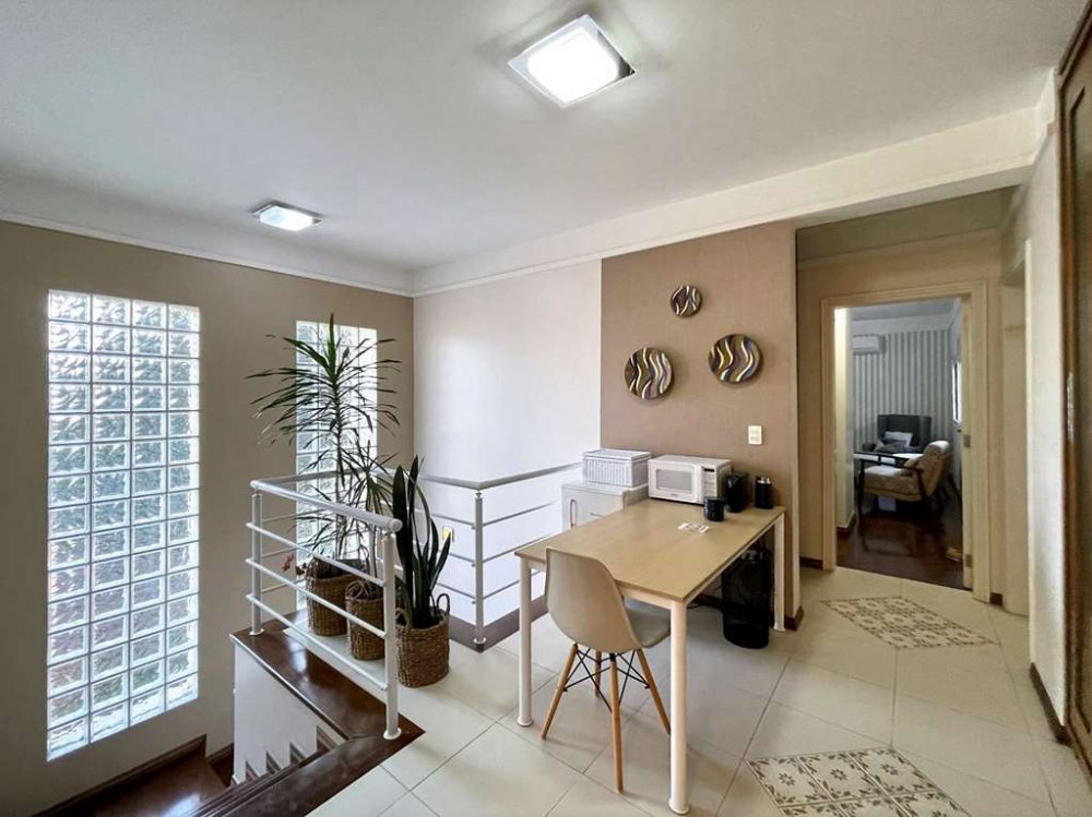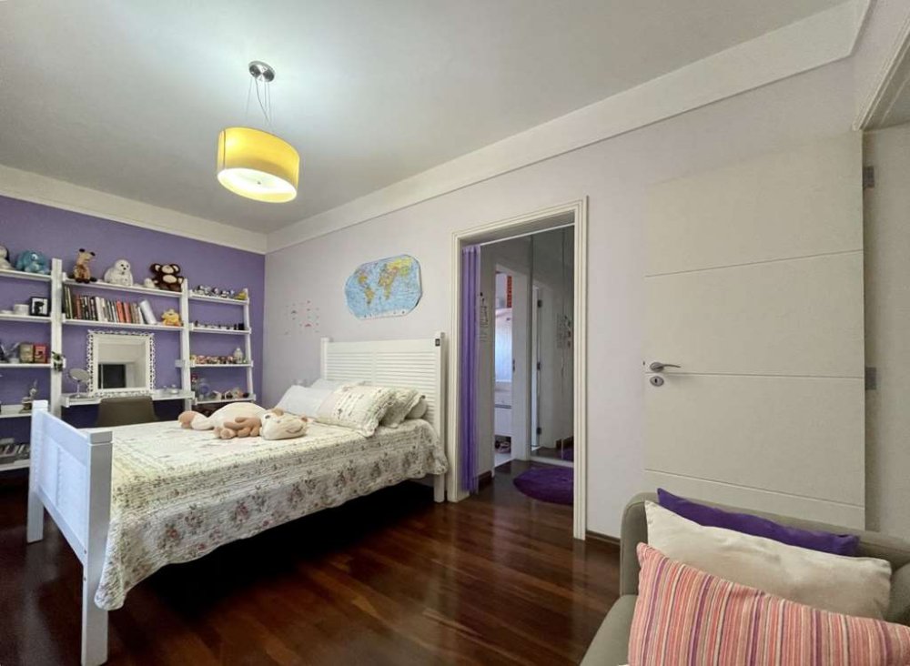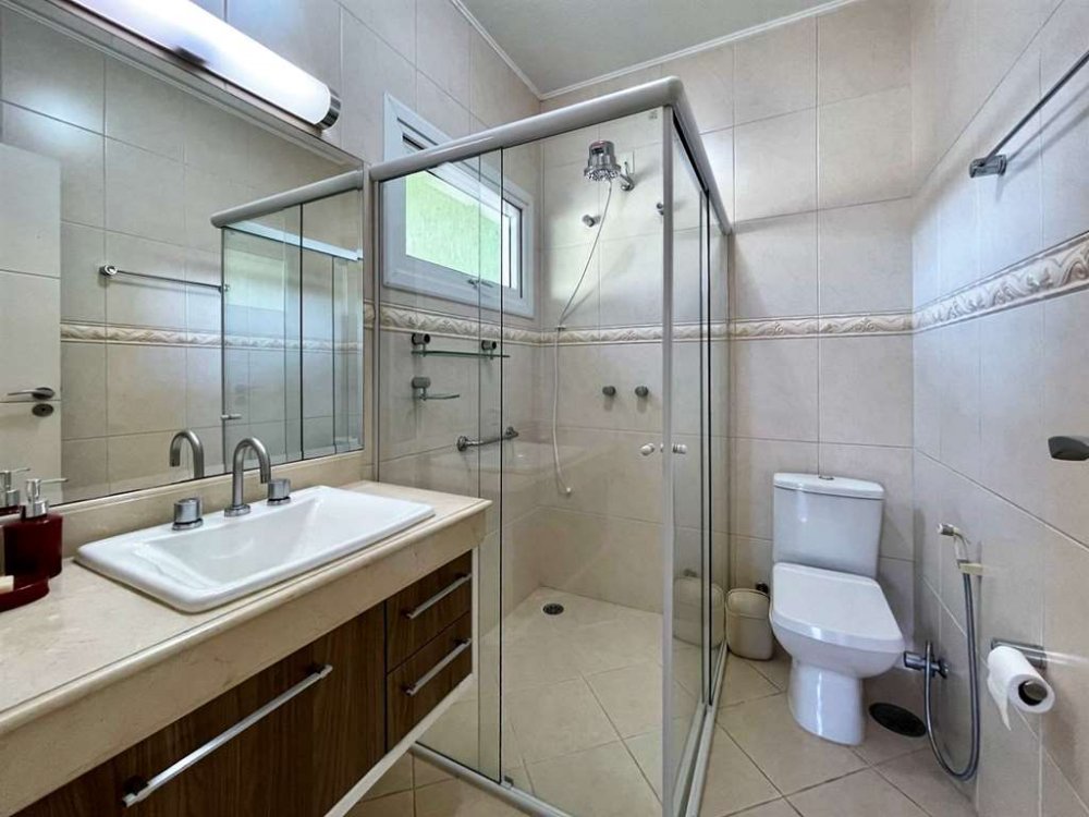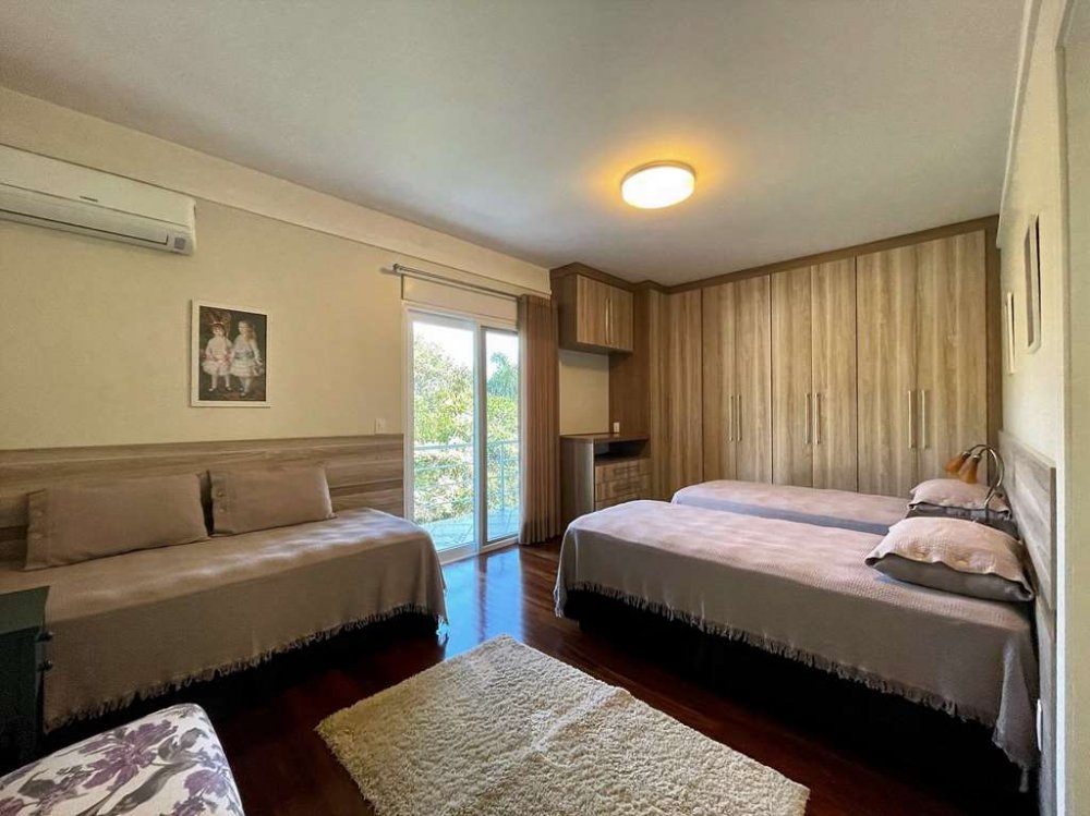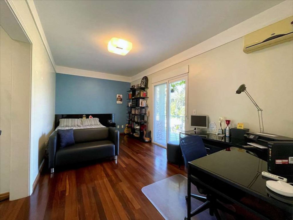 4 suítes (master com lareira) claras e ensolaradas, com Ar Condicionado, piso em madeira Cumaru impecável, com projetos de armários sob medida.