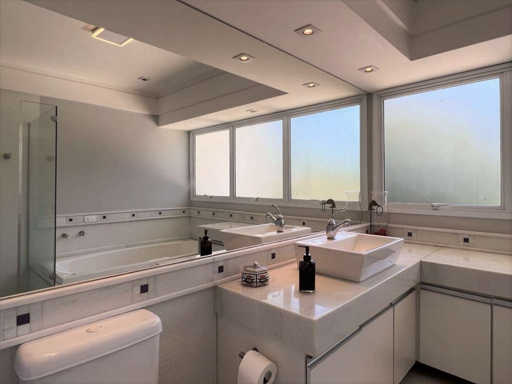 Banheiros com tampos em mármore, detalhes em pastilhas, espelhos, gabinetes e box de vidro. Sendo a máster com 2 cubas, claraboia e hidro dupla.