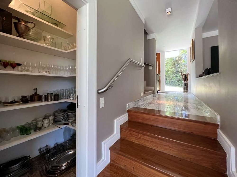 2 escadas de alvenaria para área íntima, pelo social revestida em madeira com corrimão inox e outra pela área de serviço / garagem.