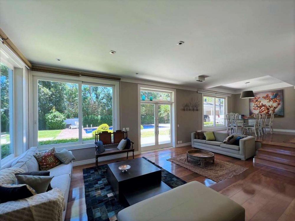 Living para 4 ambientes integrados voltados para o lazer com jardim, piscina e anexo gourmet.