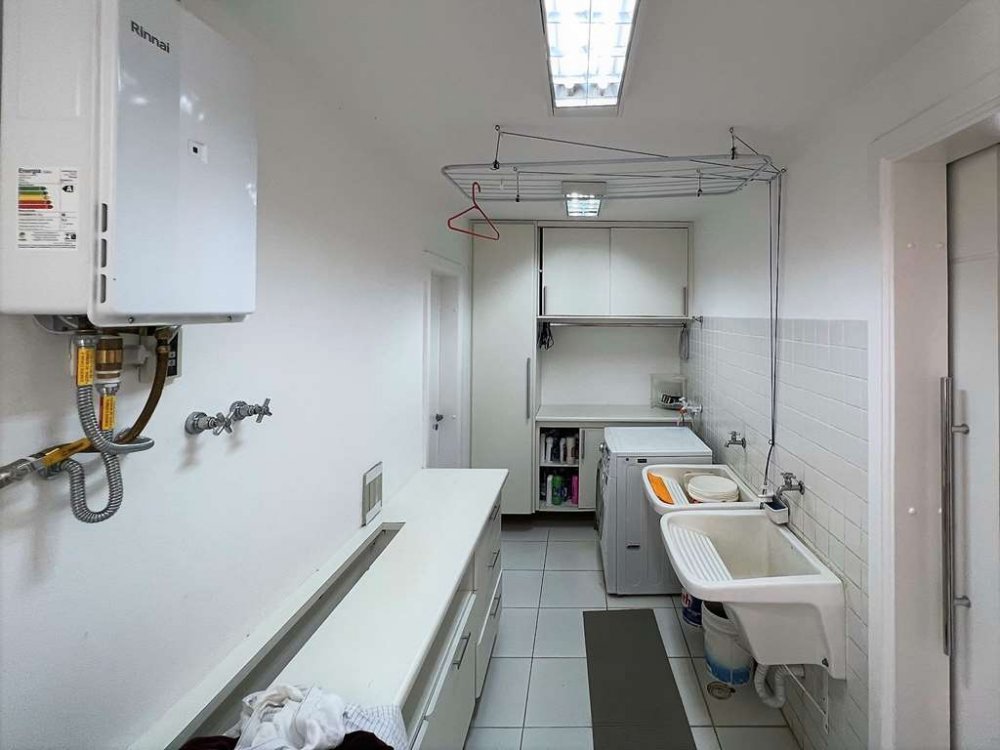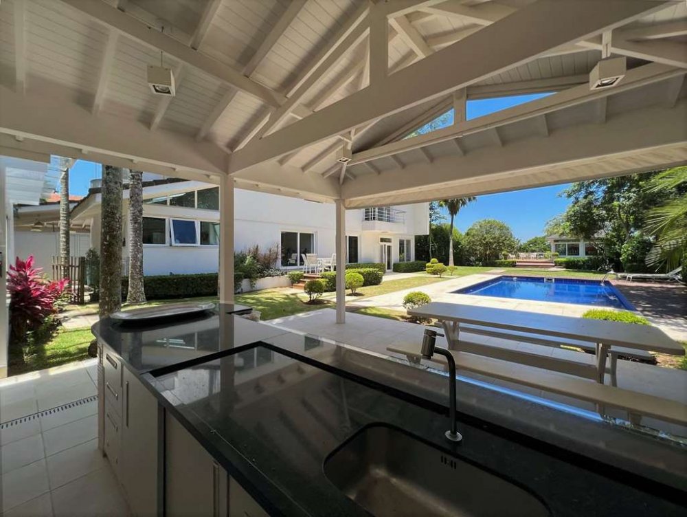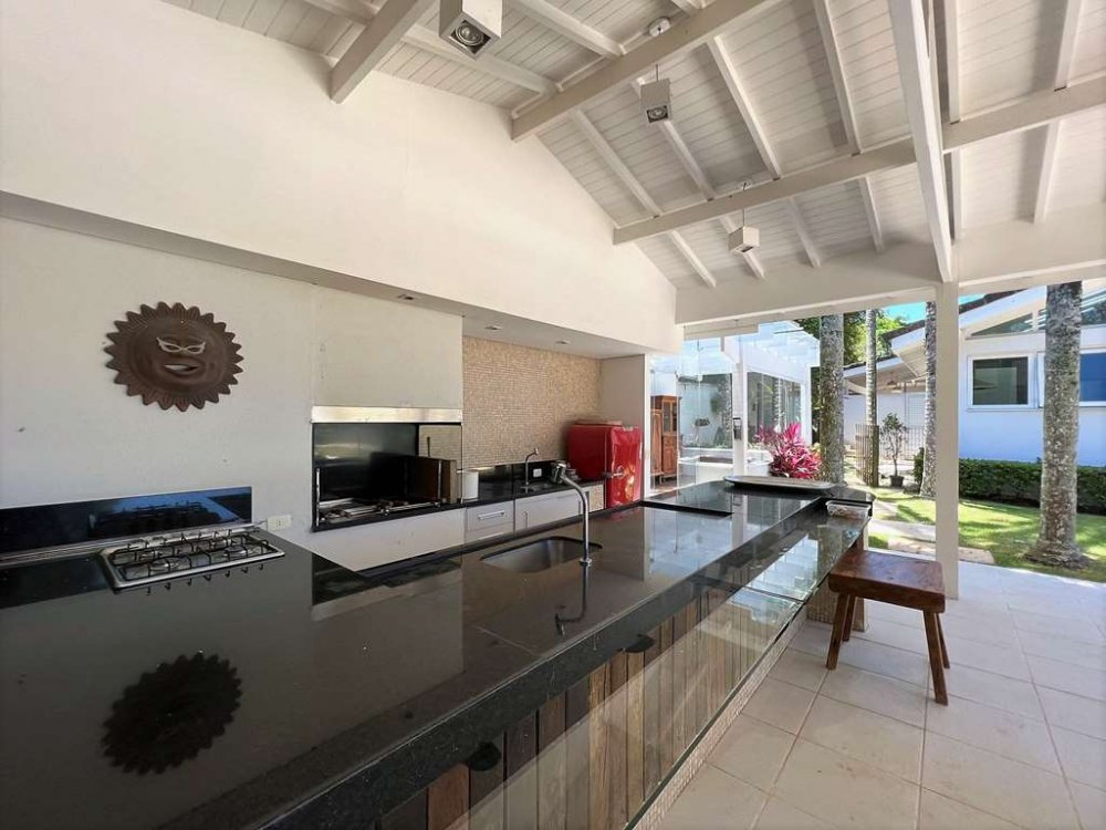 Cozinha toda planejada com sala de almoço integrada e adega, voltada para o jardim e lazer. Com bancada "U" em granito, armários, gabinetes, cuba inox, fogão 5 bocas Electrolux, coifa inox, geladeira side by side Samsung, micro Brastemp, forno elétrico e filtro.