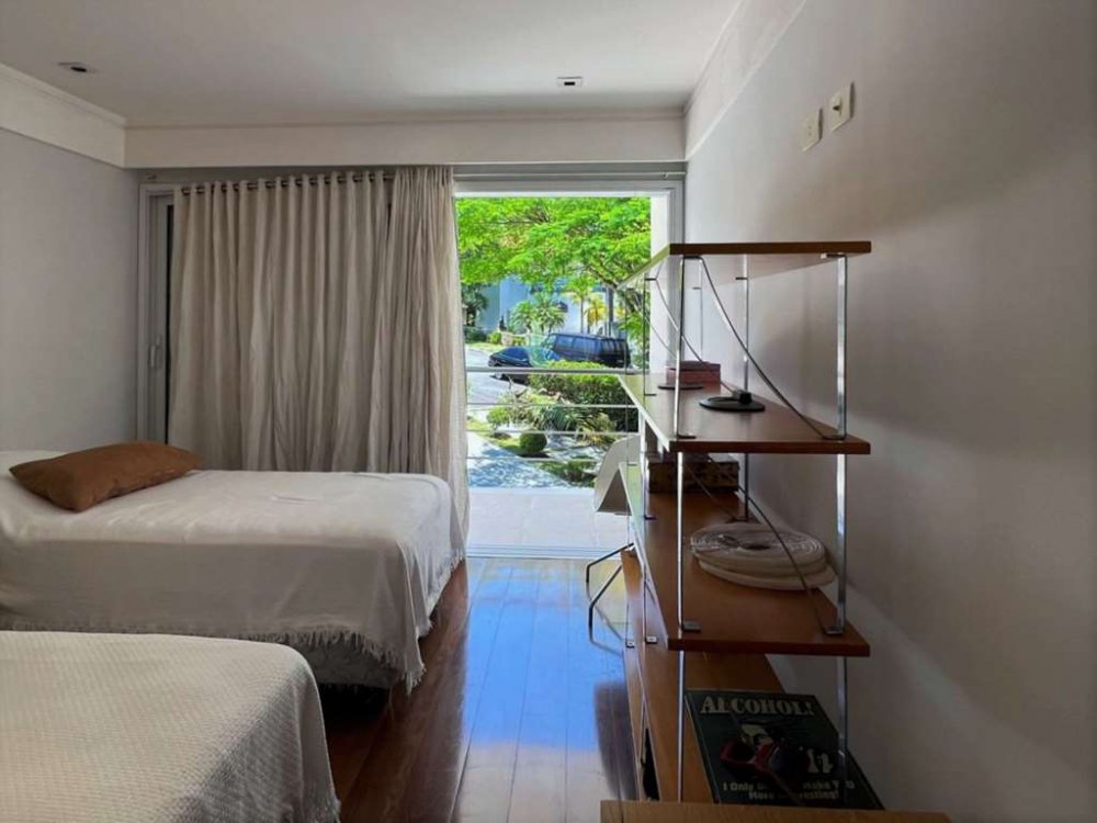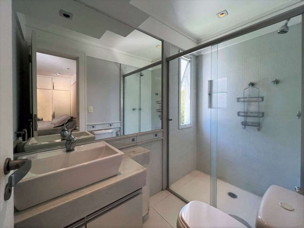Apto de serviço reversível para hóspedes, integrado ao home-theater. Banheiro com espelho e box de vidro.